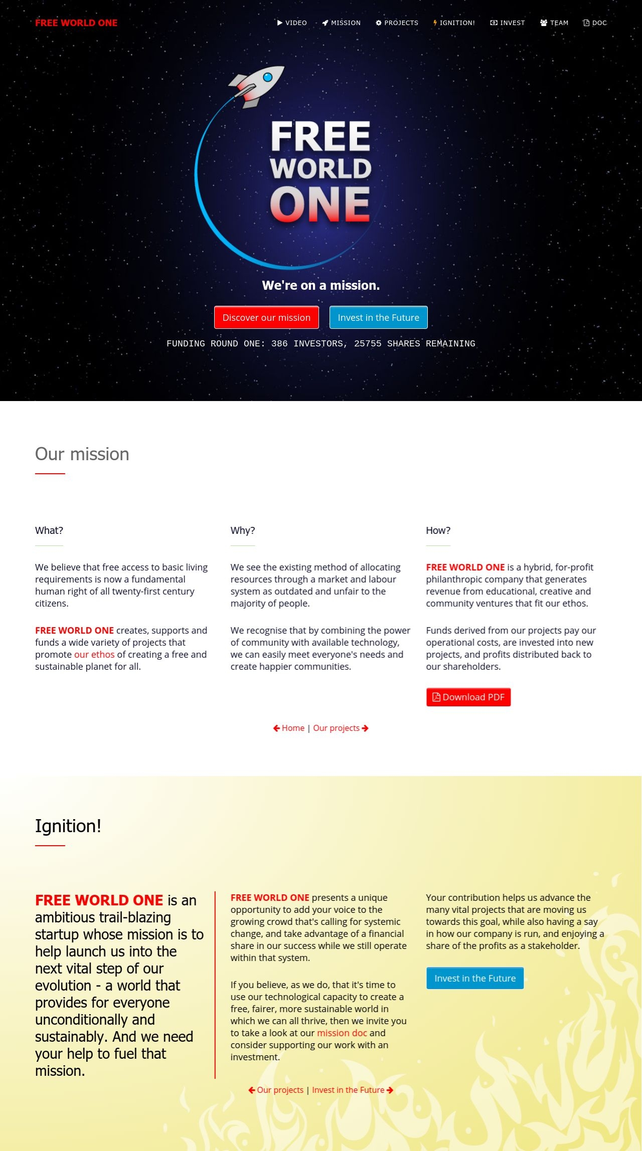 The creation of effective copy for the Free World One website involved overcoming a few hurdles, one of which was to try to portray what could be perceived as a confusing setup as simple and easy to understand.