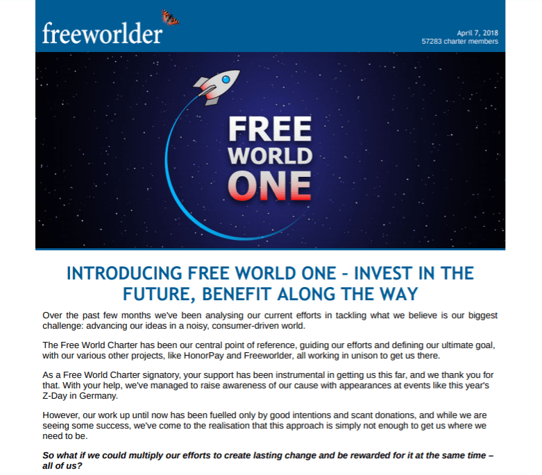 Sent to signatories of The Free World Charter, this email was designed to explain how Free World One was a positive step forward in efforts to effect change along the same lines, but using the money system to expedite those efforts.