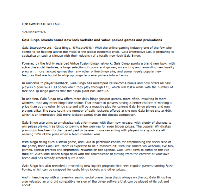 Gala Bingo’s relaunch was a very big event and thus required a lot of PR efforts to satisfy the media’s demand for details on this huge brand’s activities. I was asked to write a number of press releases on the brand’s relaunch as a result.