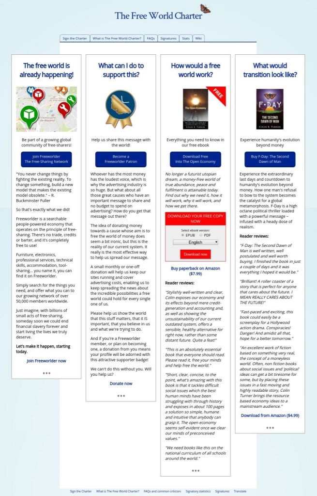 The aim of the site itself is simply to share this idea and encourage as many people as possible to learn more and sign the Charter to indicate their agreement with its principles, so that at some point enough people will agree where a tipping point is reached and it will become a reality.