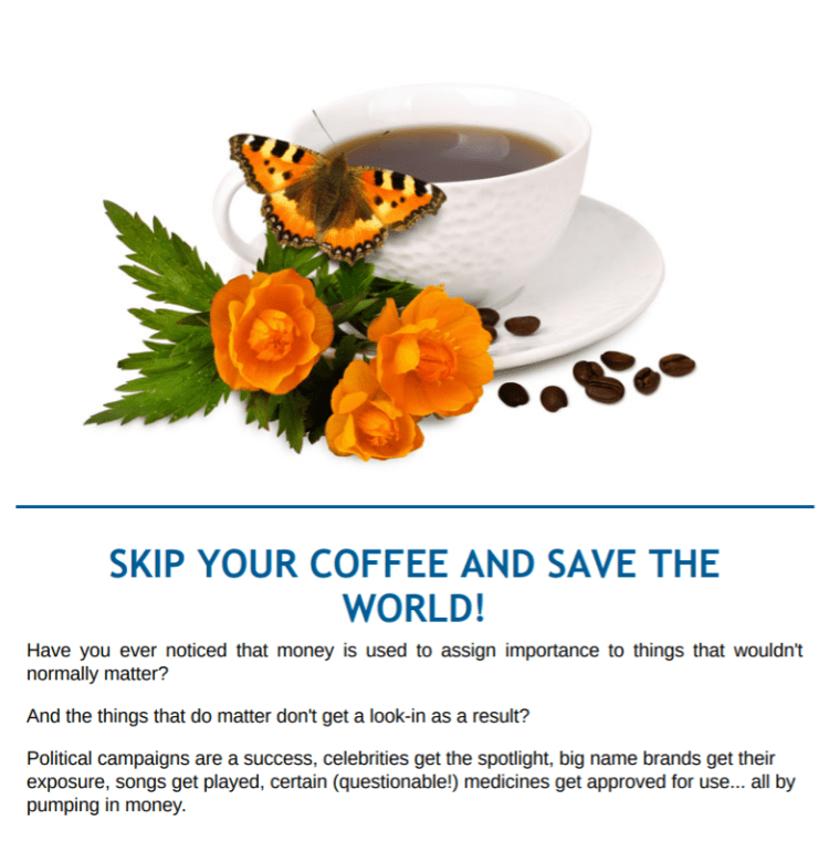 Tying the whole email into the theme of ‘skipping coffee to save the world’ helps readers to realise that something as mammoth as ‘saving the world’ needn’t be an impossible task that’s out of the reach of everyday people, but could simply be something of minimal monetary value such as skipping your coffee for the day.