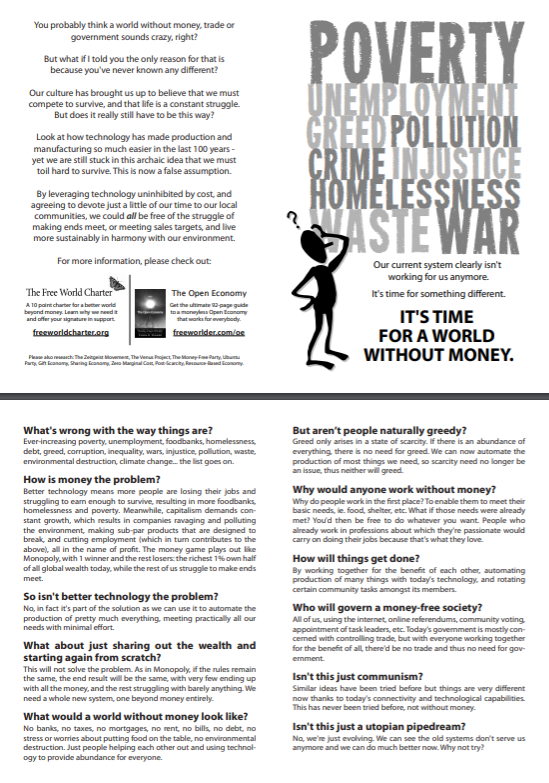 I thought creating a simple leaflet introducing the concept of a world without money would be an effective tool, especially given the knee-jerk reaction that such an idea is absurd.